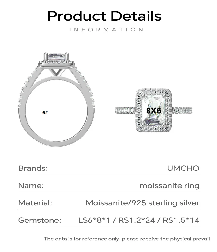 925 Sterling Silver GRA Certified 6*8mm 2CT Emerald Cut Moissanite Engagement Ring for Women